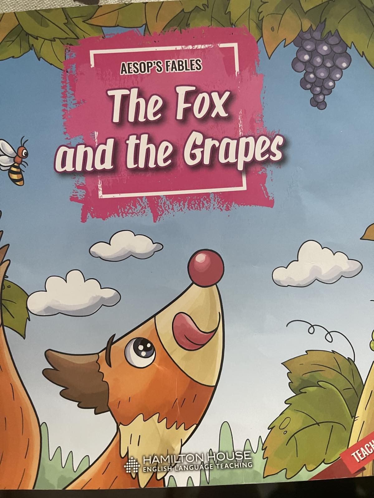One fox is happy.She smiles. She eats red berries. Fox sleeps on the grass. Fox is hungry, she sticks out her tongue, jumps, run and jump.